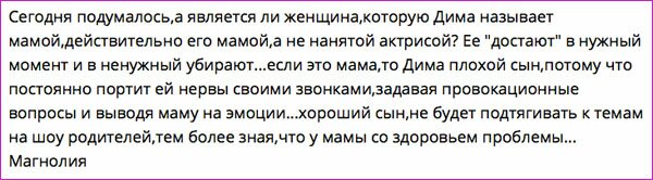 Мама Димы Дмитренко отказывалась прилететь на остров, потому что не выносит жару. Но если ведущие пригласят ее на Поляну, по словам Димы, она готова прилететь.